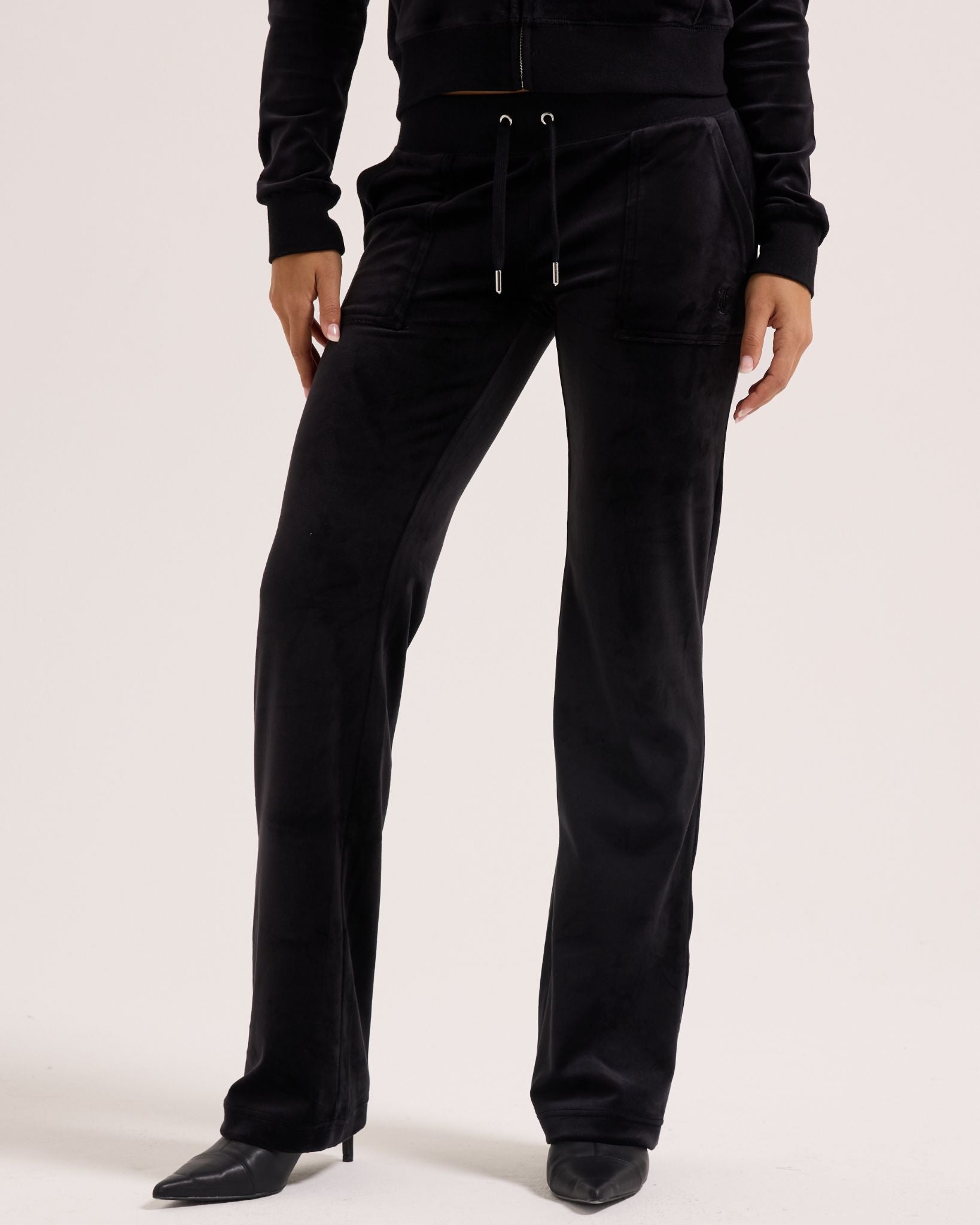 Juicy Couture High-rise plain tracksuit bottoms in classic velour. Flared leg fit, with adjustable drawstring ribbed waist and front feature patch pockets. These core joggers feature back popper fastening pockets, silver branded hardware and are finished with a tonal embroidered Juicy Couture JC-logo at the hip.